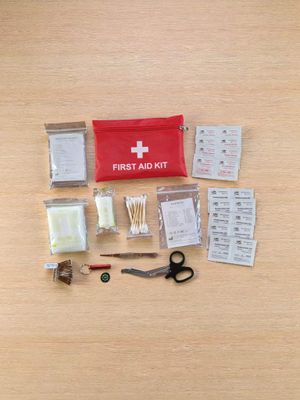 - 1x first aid kit - 1 red zippered pouch, 20pc plaster set, 8pc alcohol prep pads, 8pc iodine pads, 1 triangular bandage, 1 elastic bandage, 1 emergency blanket, 25pc cotton buds, 1 tweezers, 1 scissors, 1 whistle, 1 compass, 12pc safety pins.