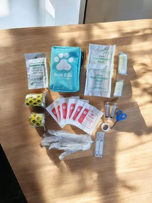 - Pet first aid kit - 1x pet first aid kit pouch - 2 non-woven pads, 1 abdominal pad, 6 gauze pads, 1 pair pvc gloves, 2 elastic bandages, 2 adhesive bandages, 2 syringes, 2 eye wash solutions, 1 bandage scissors, 1 medical tape, 1 tick remover